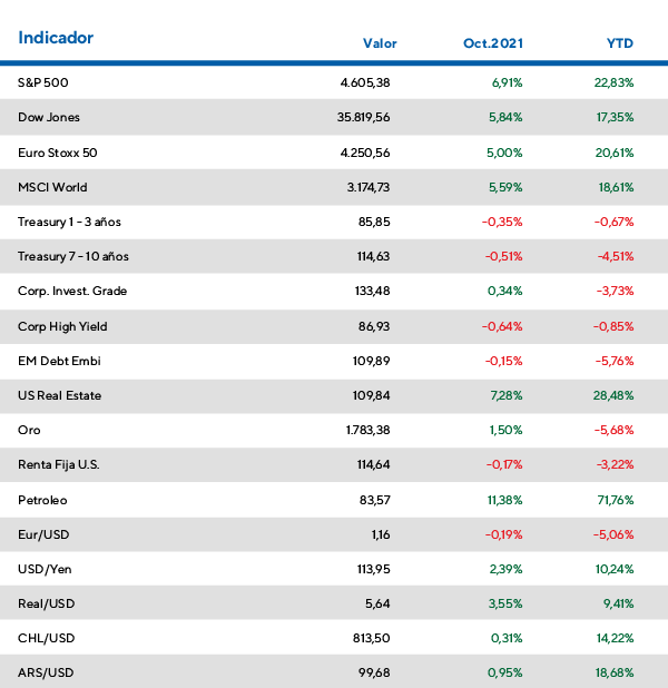 La renta variable, en cambio, continúo sin sobresaltos con el bull market. Los principales índices de EE.UU. cerraron el mes con ganancias para el inversor. Una temporada muy favorable en resultados de las compañías le da combustible a un ciclo alcista para las acciones. Más de la mitad de las empresas del S&P 500 han reportado resultados, y la estimación de crecimiento de ganancias para las compañías en el T3 se ubica en el 36,60% interanual.