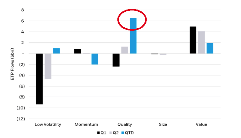 Como se puede ver en el gráfico, los ETF de acciones estadounidenses consideradas de calidad, tuvieron un ingreso de fondos en el tercer trimestre por más de USD 6.000 millones, ganándole por lejos a los demás tipos de acciones.